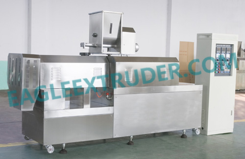 濟南大鵬機械設備雙螺桿膨化機由供料系統、擠壓系統、加熱系統、傳動系統、旋切系統和控制系統等幾部分組成。將物料由喂料機喂入,機筒經過高溫、高壓、高剪切,使物料膨化以達到所需的組織狀態等品質要求。