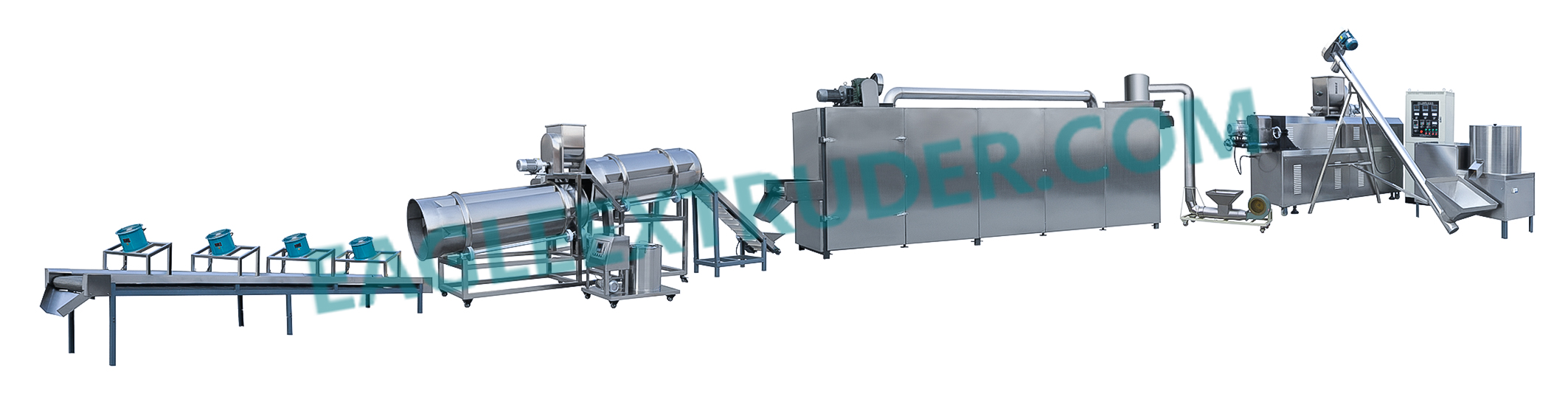 公司多年來在擠出機方面的努力取得的技術優勢完全體現在寵物食品生產線上。操作簡單、易學、的參數控制,確保產品在特定的溫度、壓力、濕度和時間里完成。合理的結構設計,特殊的材質,快速的自潔性能確保機械的穩定性及便于維修。豐富多采的形狀和口味適應各種寵物食品的要求。寵物食品生產線由拌粉機、雙螺桿擠出機、風送機、干燥機和調味機組成。