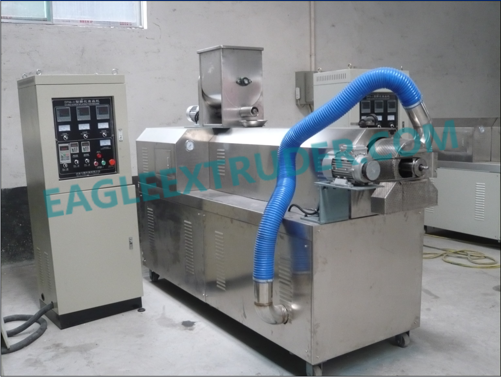 濟南大鵬機械設備雙螺桿膨化機由供料系統、擠壓系統、加熱系統、傳動系統、旋切系統和控制系統等幾部分組成。將物料由喂料機喂入,機筒經過高溫、高壓、高剪切,使物料膨化以達到所需的組織狀態等品質要求。