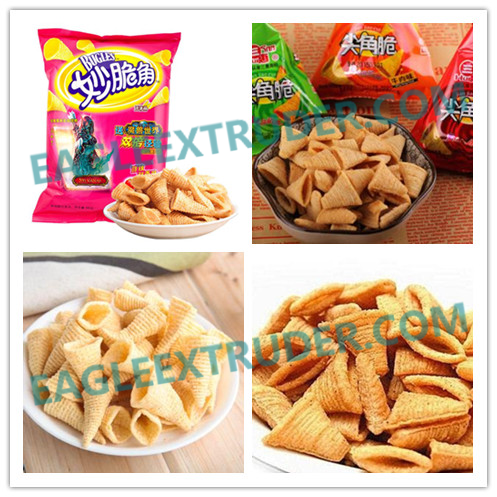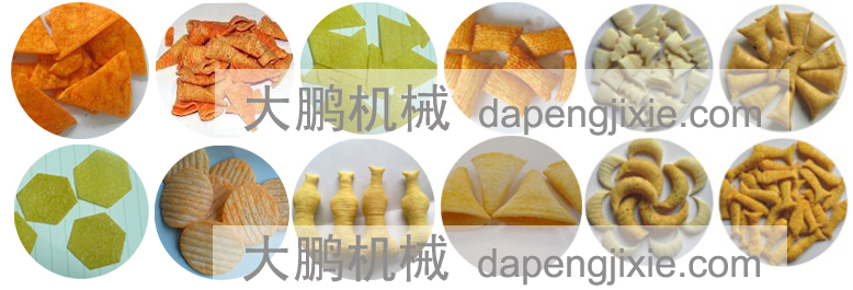 拌料機--輸送機—膨化機--成型切斷機--輸送機--油炸鍋--提升機--調味機